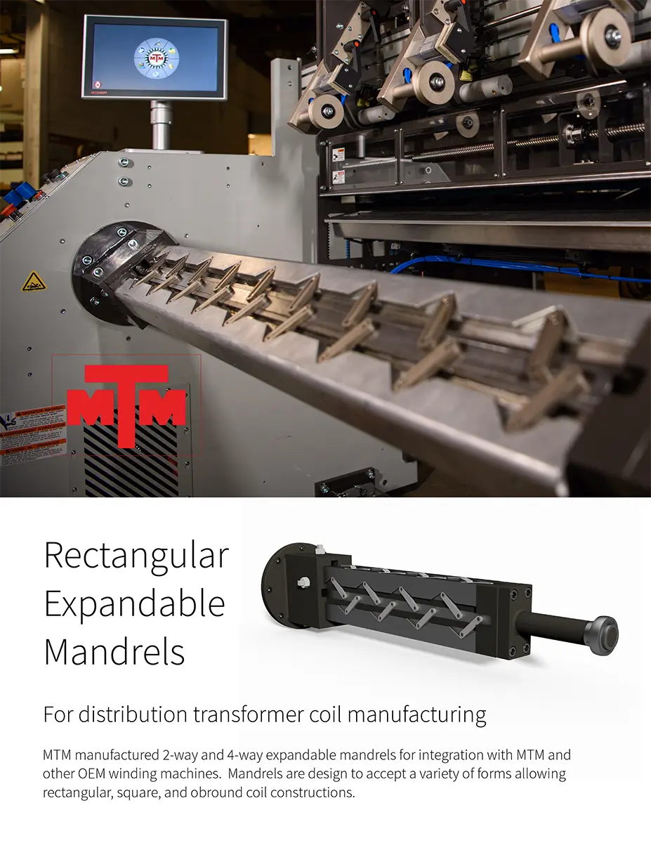 MTM manufactured 2-way and 4-way expandable mandrels for integration with MTM and other OEM winding machines. Mandrels are designed to accept a variety of forms allowing rectangular, square, and obround coil constructions.